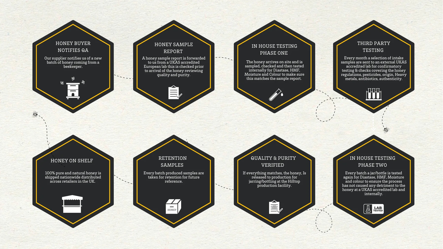 We adhere to rigorous testing standards to ensure every bottle is as pure and authentic as if it came straight from the hive. Each batch is fully traceable back to the beekeepers who produced it, and we meticulously test every batch twice to guarantee quality and unadulterated honey in every single drop.
